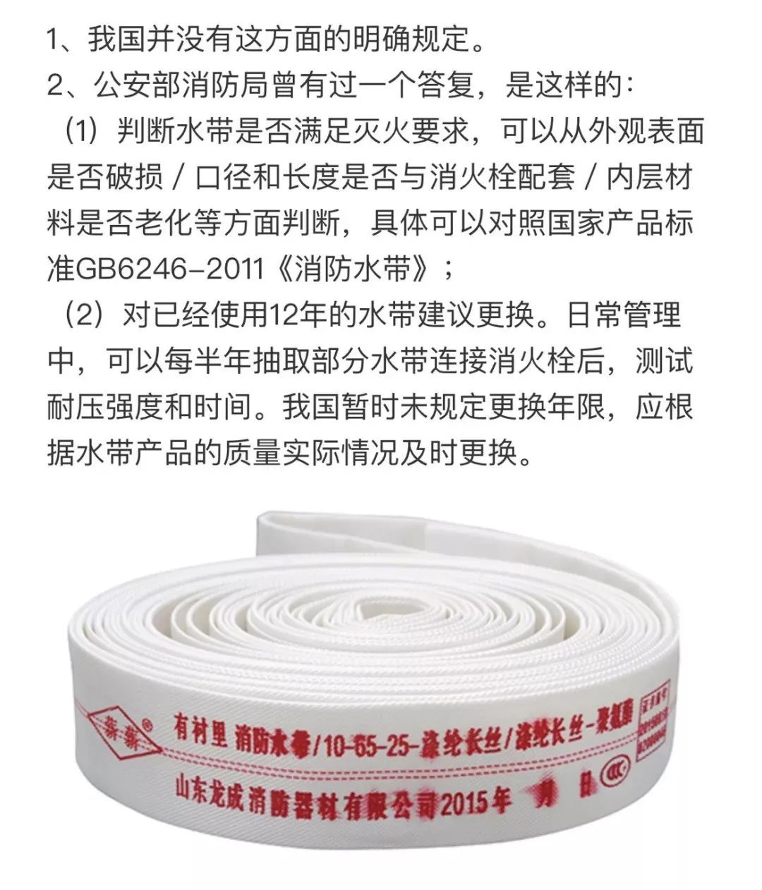 根據(jù)標(biāo)準(zhǔn),消防水帶沒有具體的報(bào)廢年限,但是應(yīng)根據(jù)水帶的實(shí)際耗損情況及時(shí)更換。